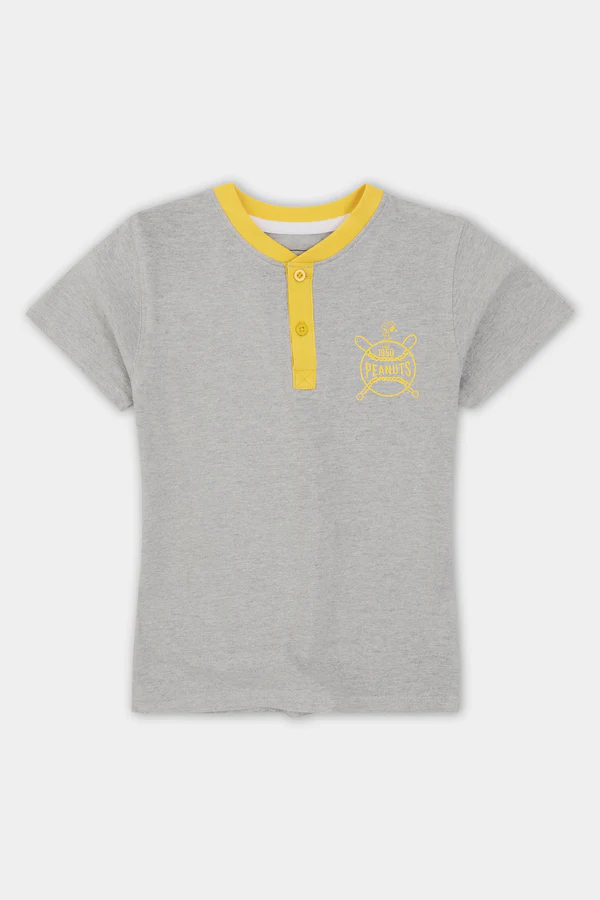 A stylish and comfortable grey jersey T-shirt with a sporty touch. The yellow collar and button placket add a fun contrast, while the embroidered chest logo gives it a cool look. Perfect for kids who love to stay active and stylish.